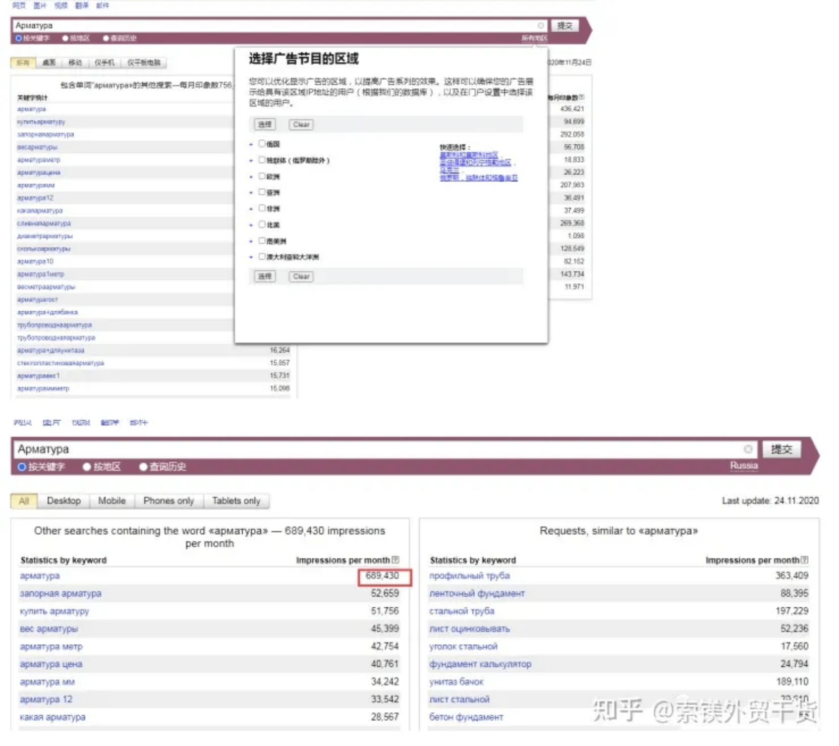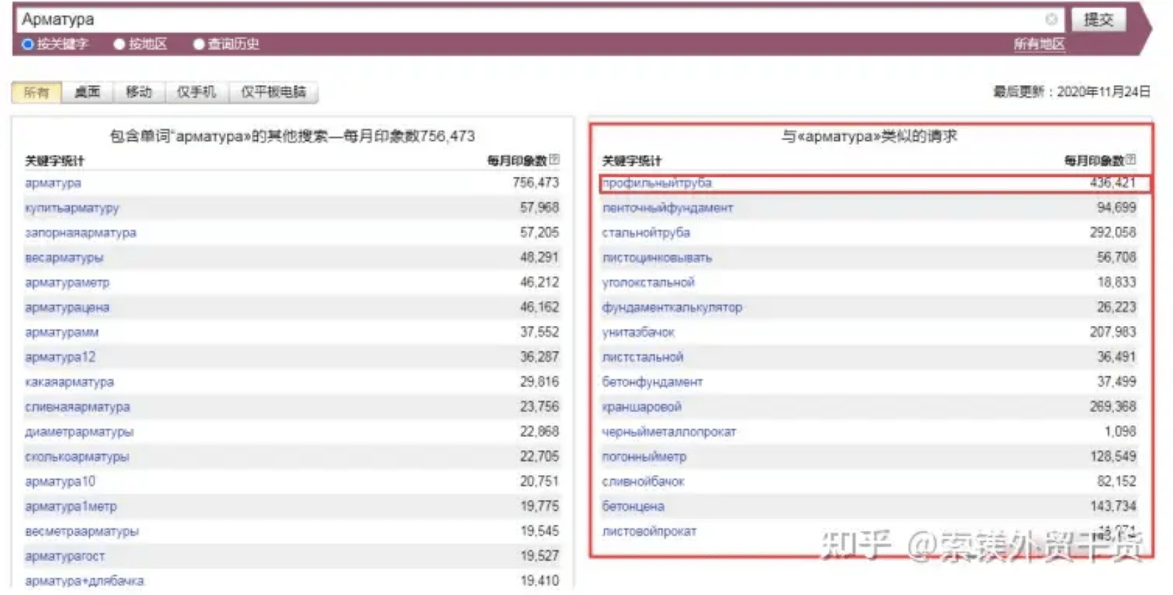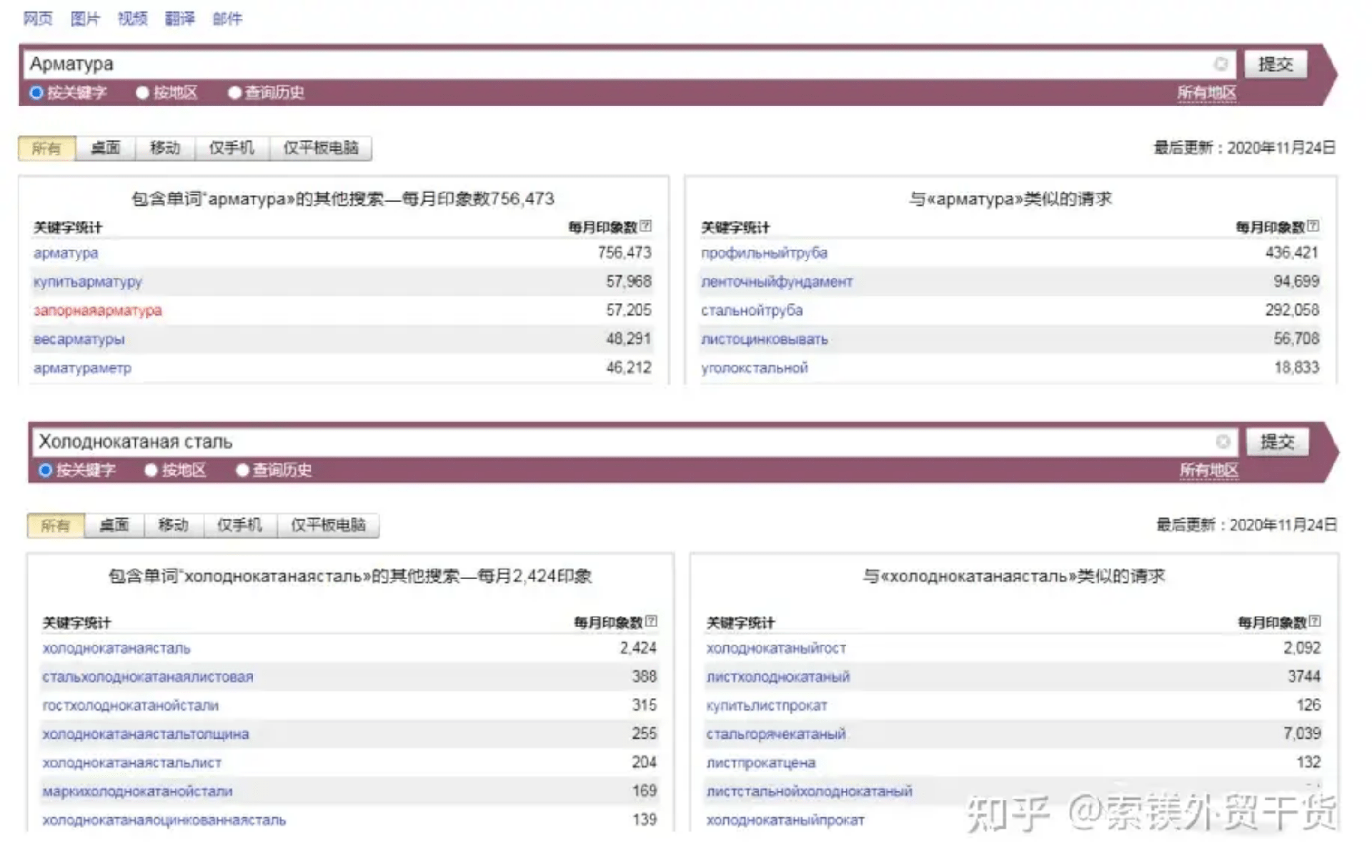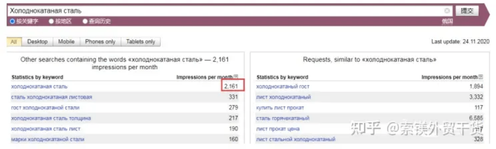 分別輸入鋼管企業(yè)常見(jiàn)的出口產(chǎn)品,這里我們選擇Арматура(螺紋鋼)和Холоднокатаная сталь(冷軋鋼),可以看到螺紋鋼的搜索量為756473,遠(yuǎn)高于冷軋鋼。
